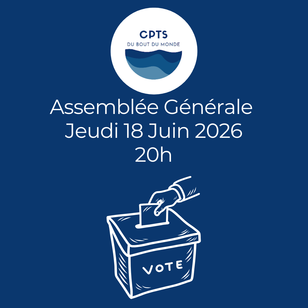 Assemblée générale CPTS + Ajouter à mon Agenda Google + iCal / Outlook export 00 jours 00 heures 00 minutes 00 secondes Date Juin 18 2026 Heure 20h00 - 23h00 Partagez cet événement
